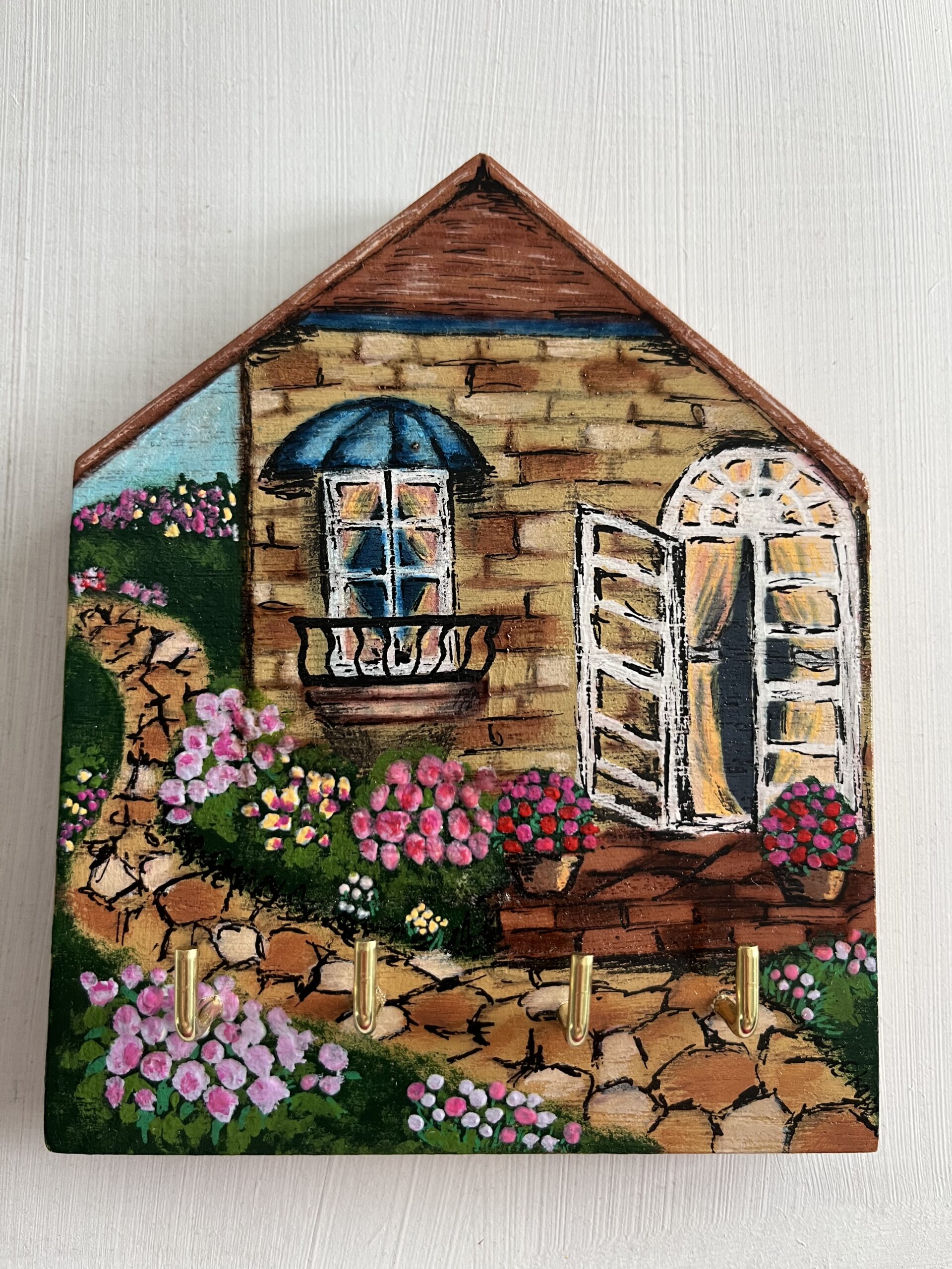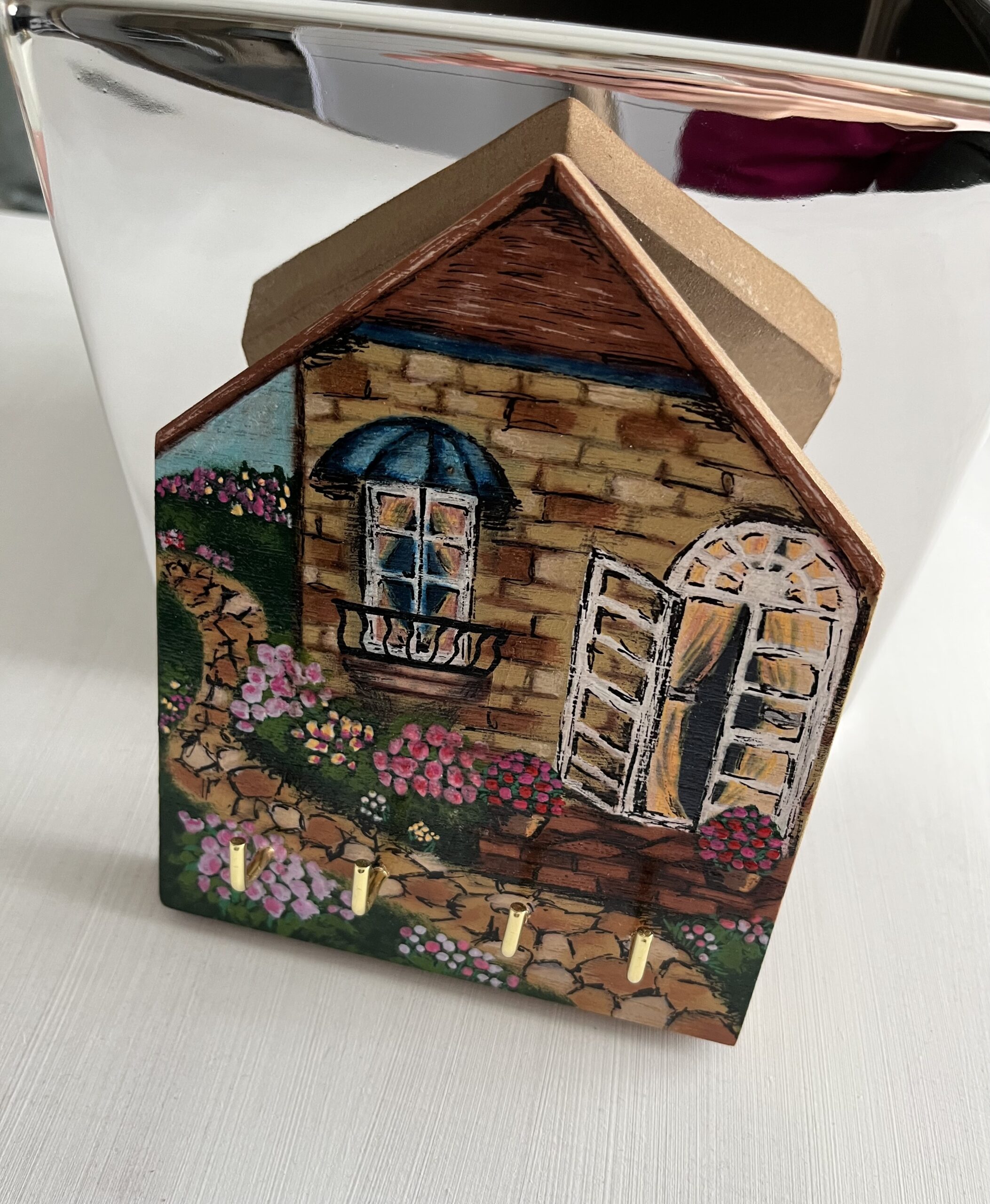 Fából készült, festve és lakkozva. Méret: 10x 12x 15 cm, 1,5 cm széles. 4 kulcstartóval, hátul akasztóval ellátva.