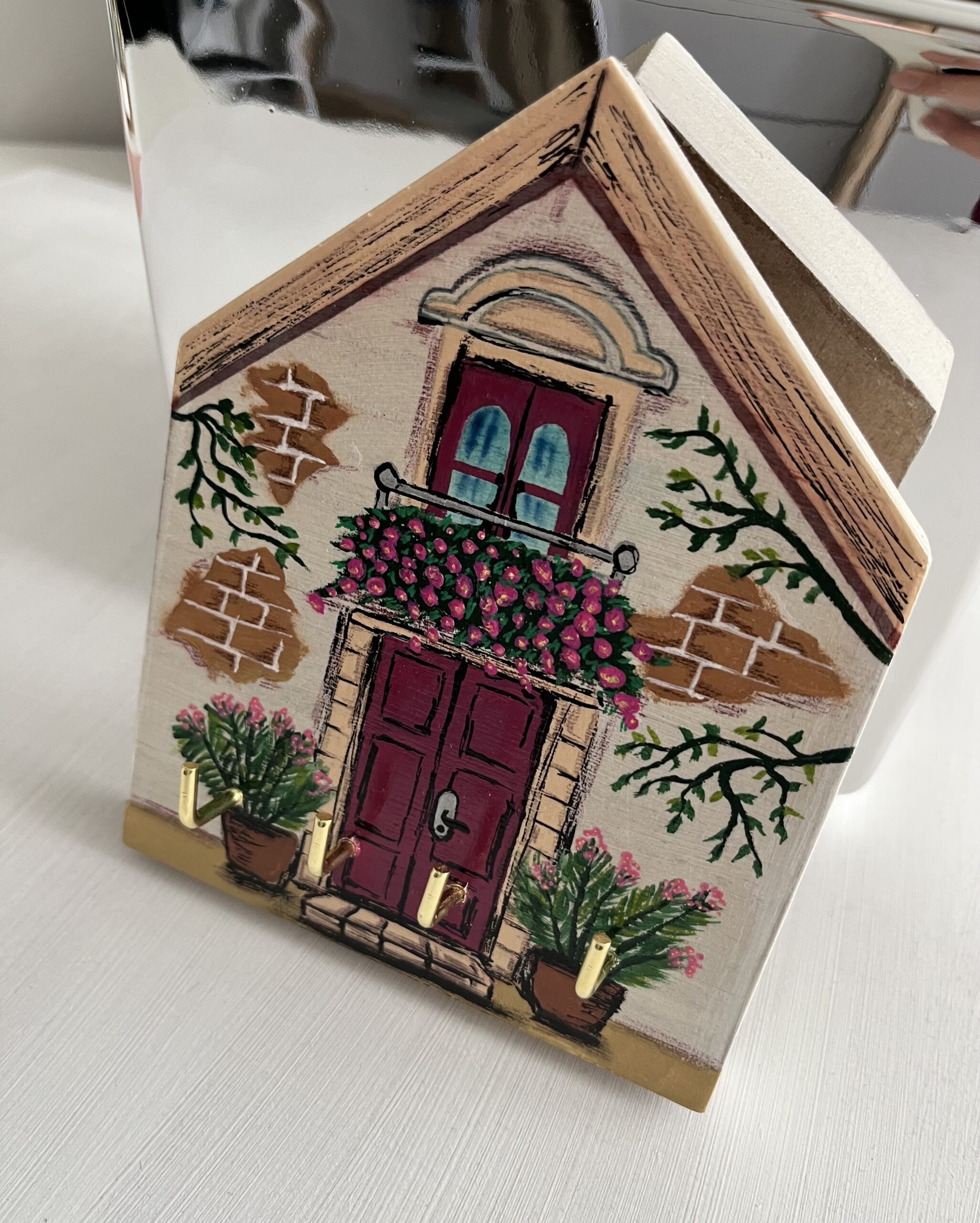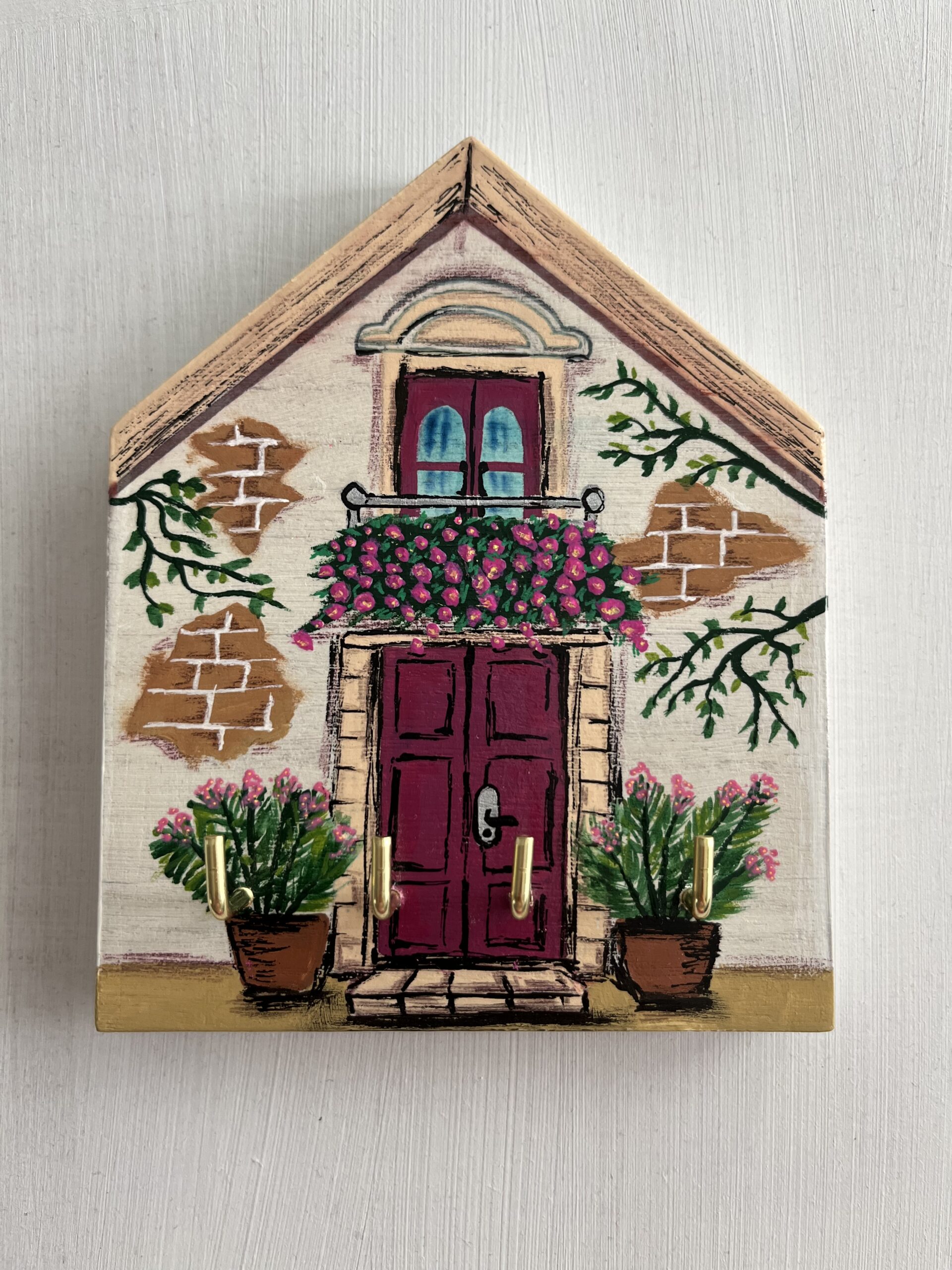 Fából készült, festve és lakkozva. Méret: 10x 12x 15 cm, 1,5 cm széles. 4 kulcstartóval, hátul akasztóval ellátva.